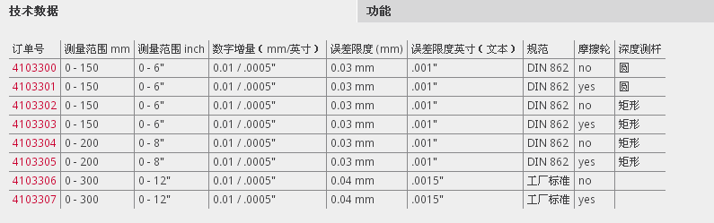 | 訂單號(hào) | 測量范圍 mm | 測量范圍 inch | 數(shù)字增量(mm/英寸) | 誤差限度 (mm) | 誤差限度英寸(文本) | 規(guī)范 | 摩擦輪 | 深度測桿 |